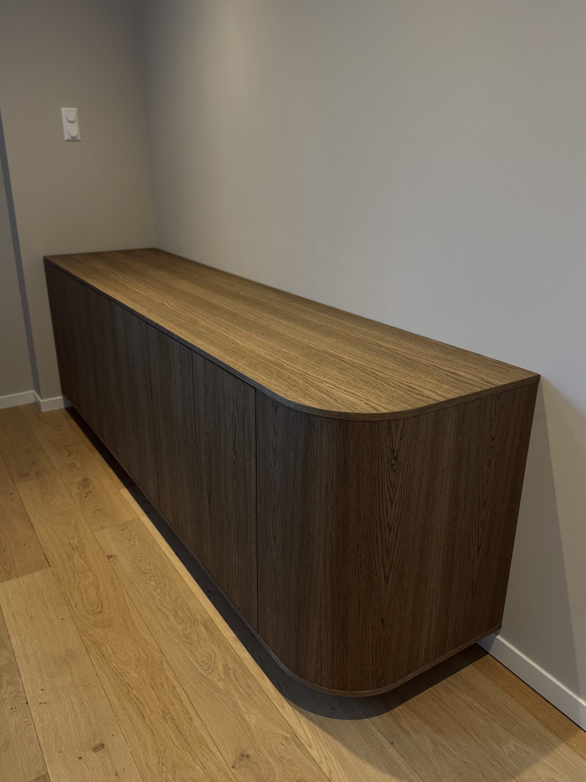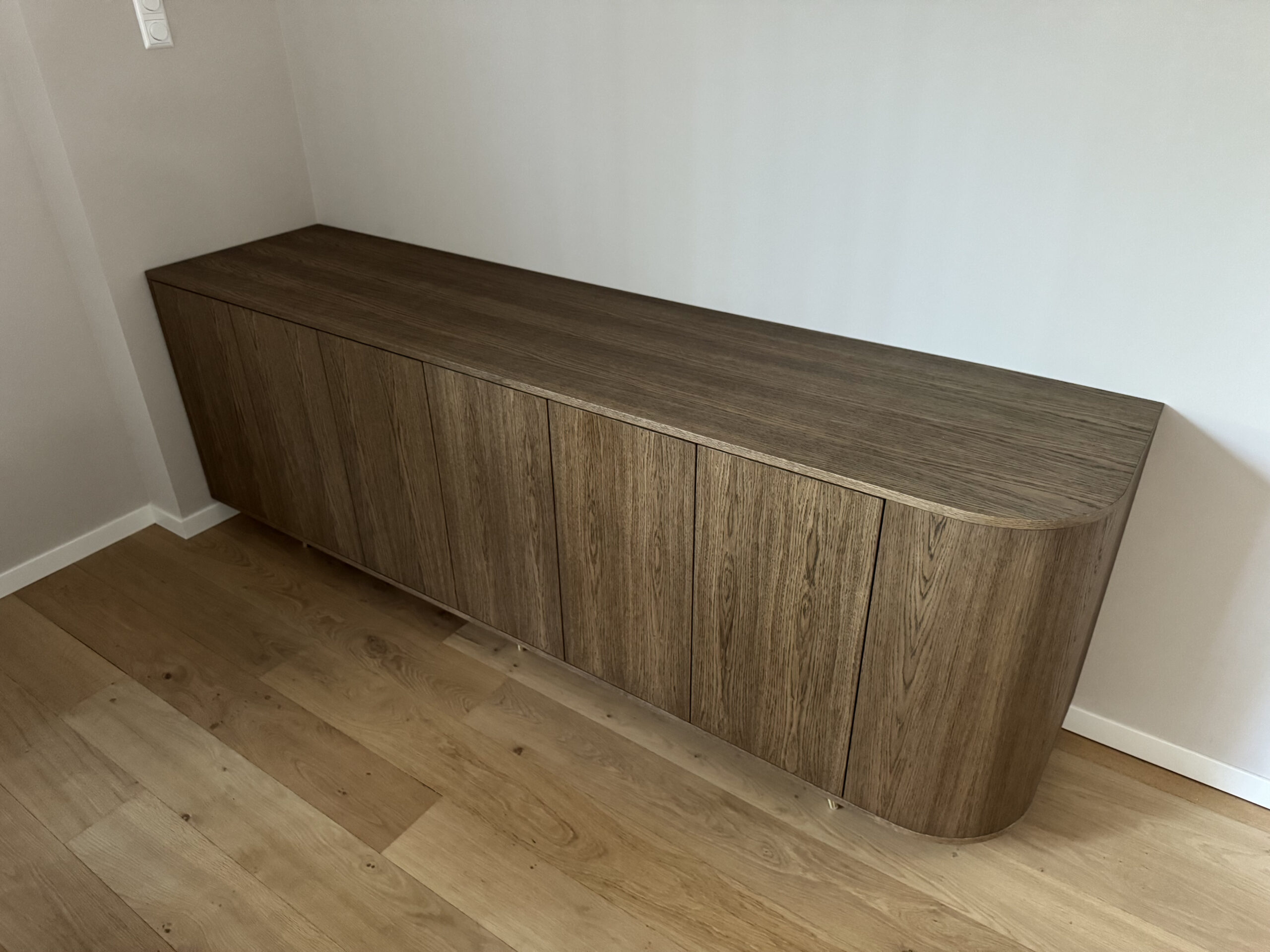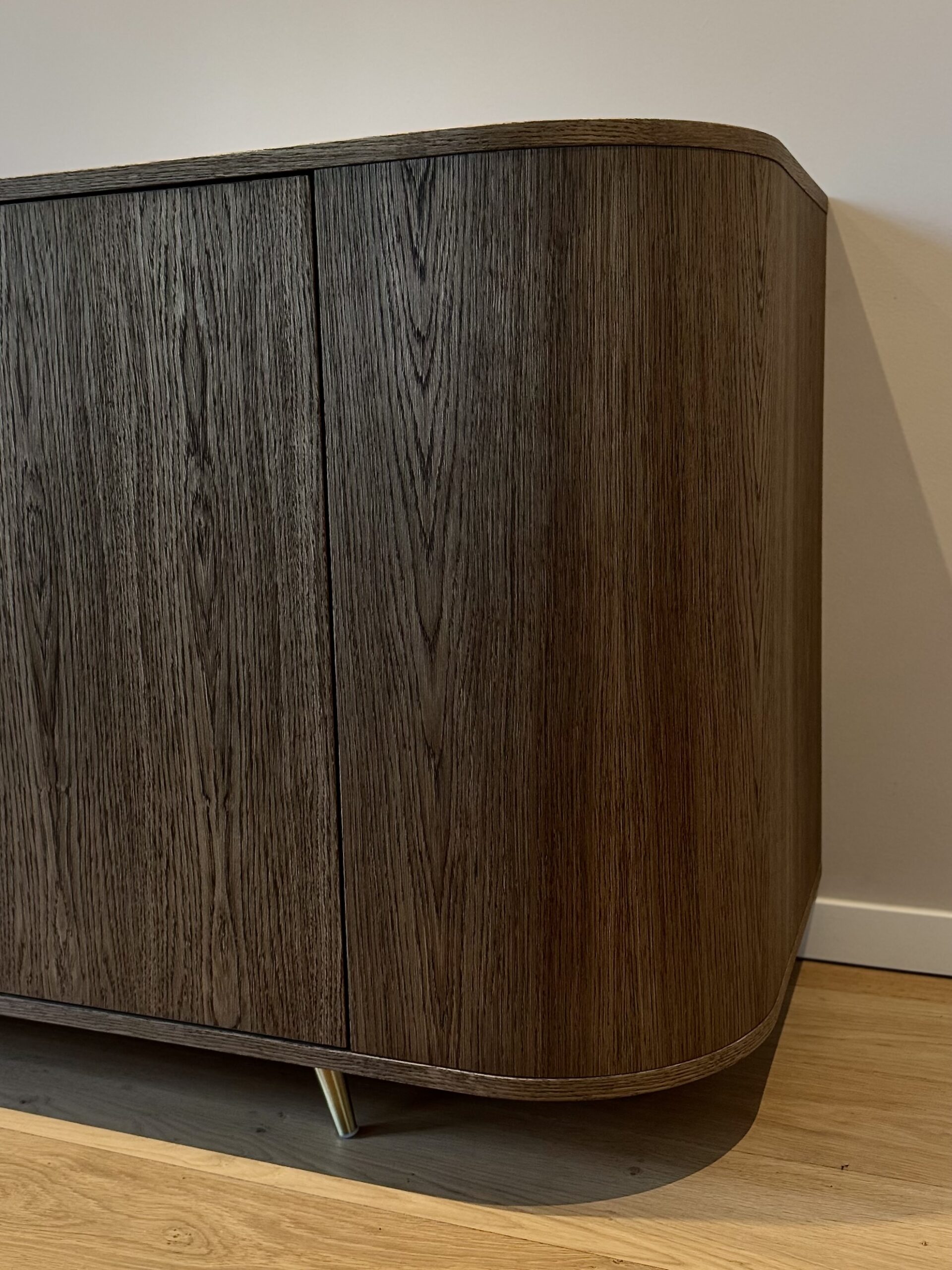 Ik heb dit dressoir gemaakt, de gebuikte materialen zijn gefineerd mdf. De afwerking is geolied met monocoat. Hij heeft een afgeronde kant voor een elegante uitstraling, hij staat op gouden subtiele pootjes. Hebt u interesse in een dressoir kast? Neem contact op!