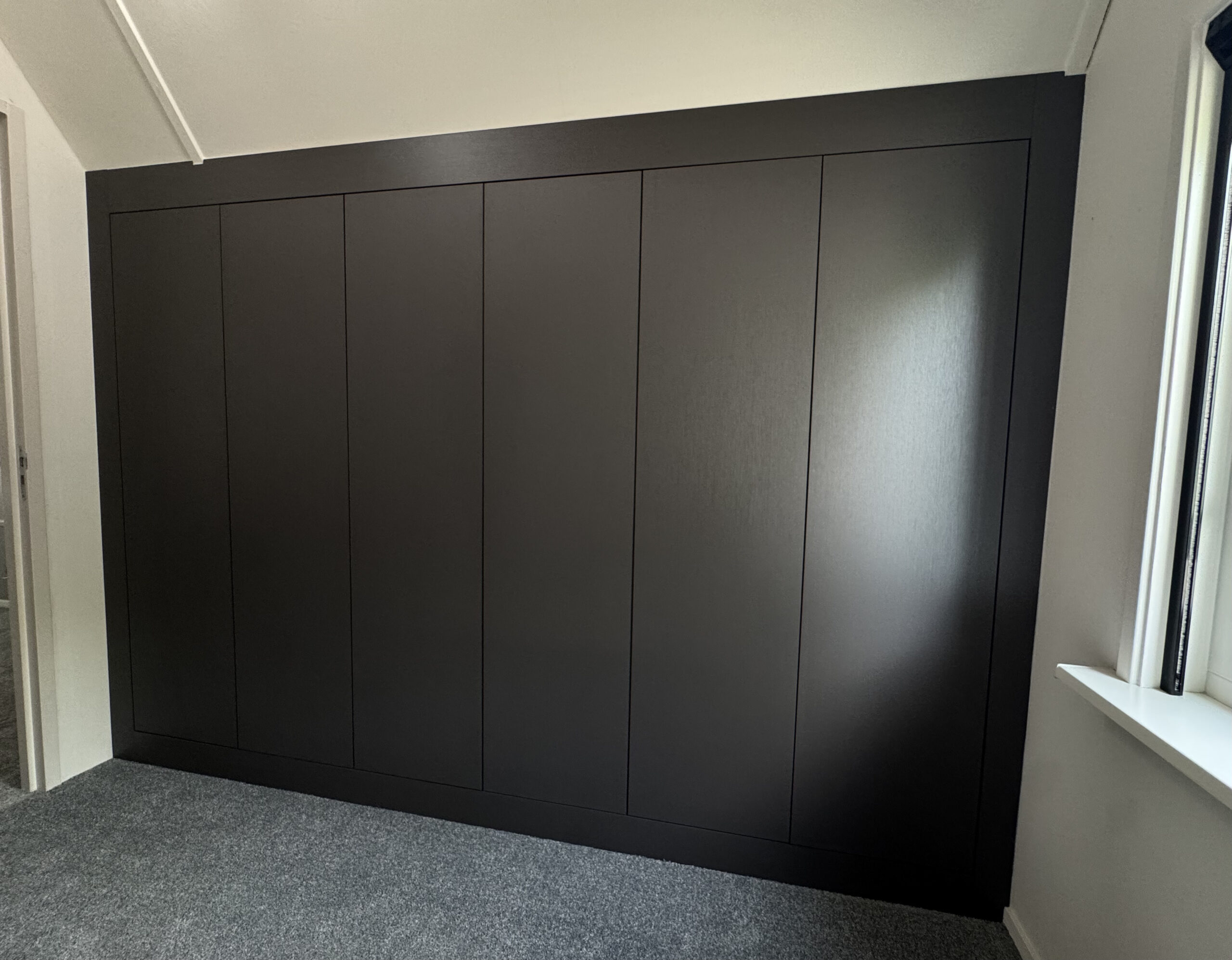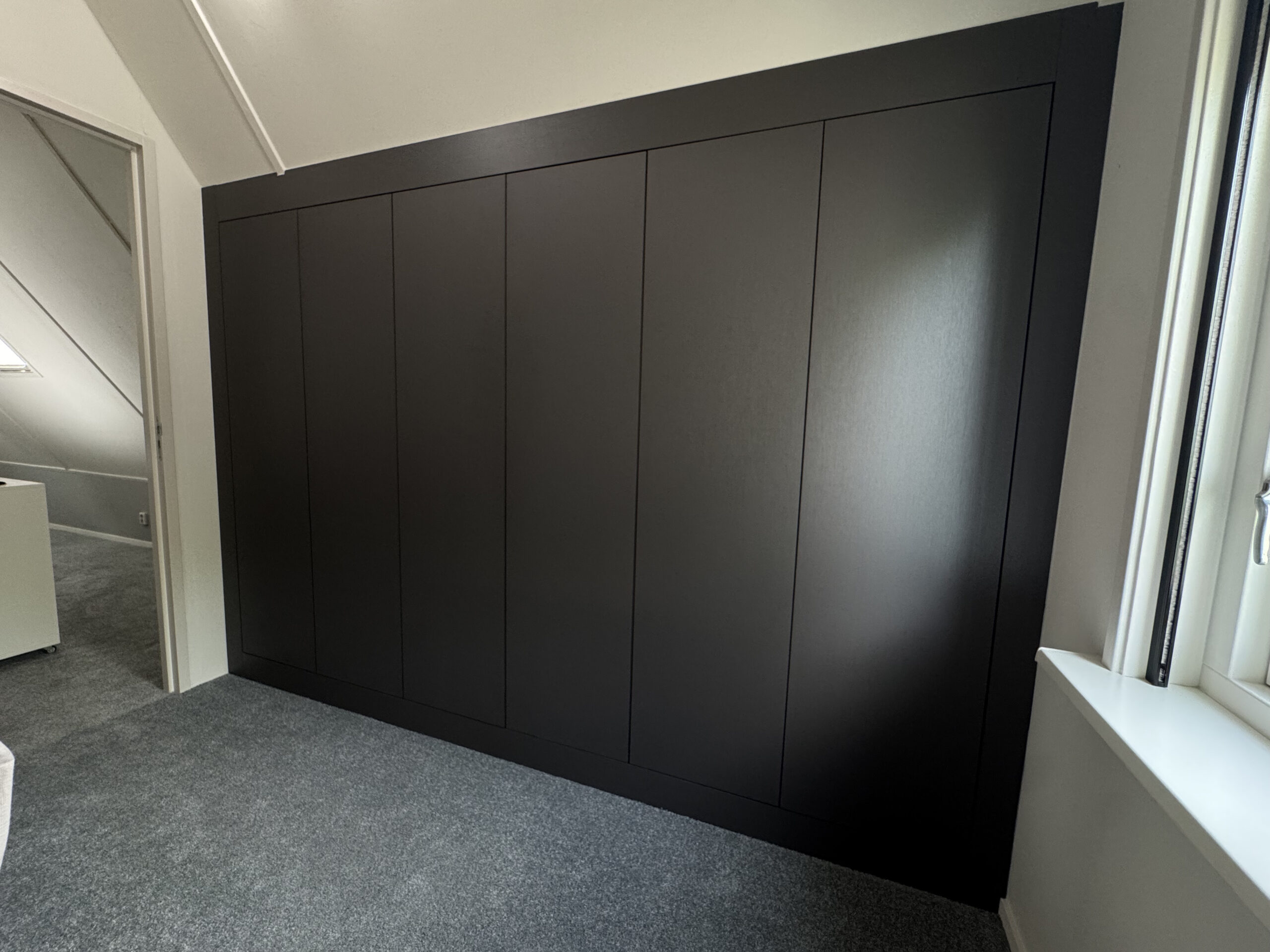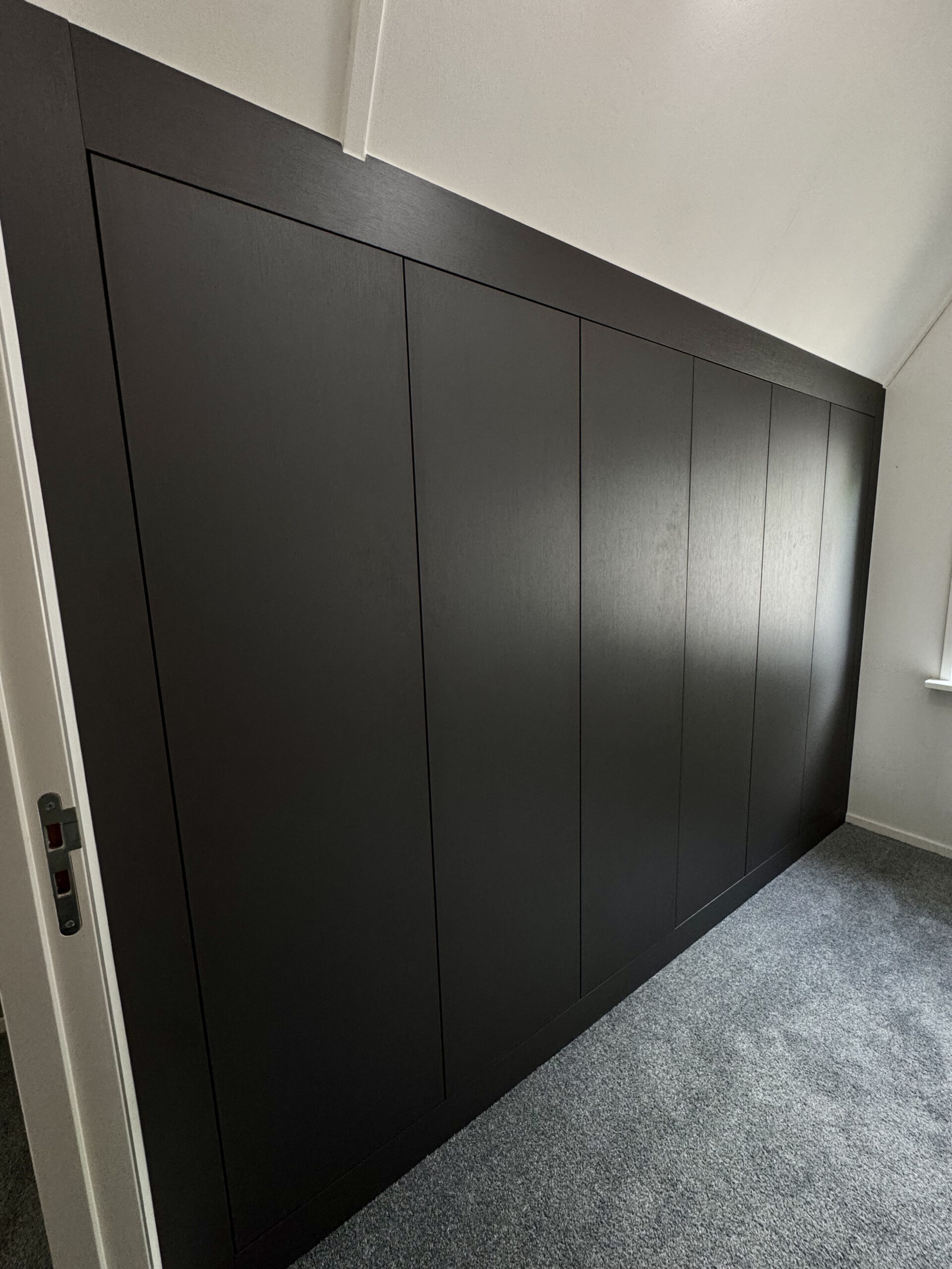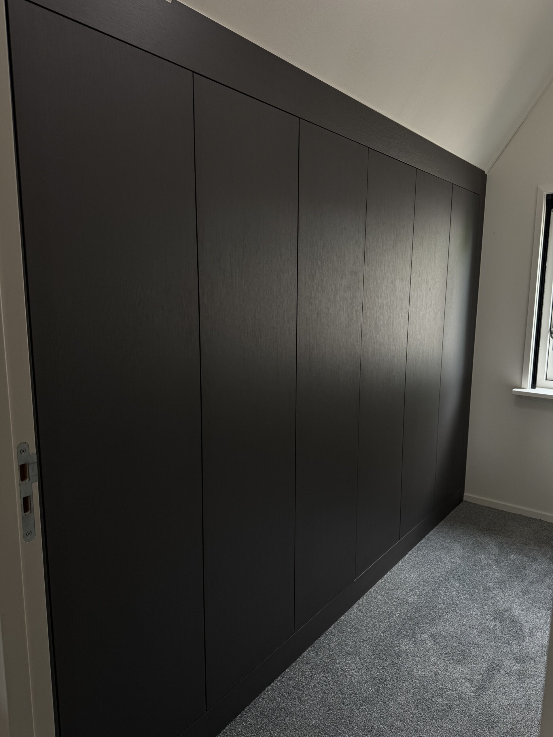 Deze op maat gemaakte inbouwkast benut alle ruimte onder het schuine dak en transformeert een lastige hoek in een stijlvolle, functionele opbergruimte. Door de kast naadloos te laten aansluiten op de schuine wand ontstaat er een strak geheel, zonder verlies van ruimte. Greeploze deuren voor een rustige en moderne uitstraling als resultaat. Het meubel is vervaardigd uit kwalitatief materiaal van Decolegno. Heeft u ook behoefte aan een inbouwkast die alle ruimte benut onder uw schuine dak? Neem contact op!