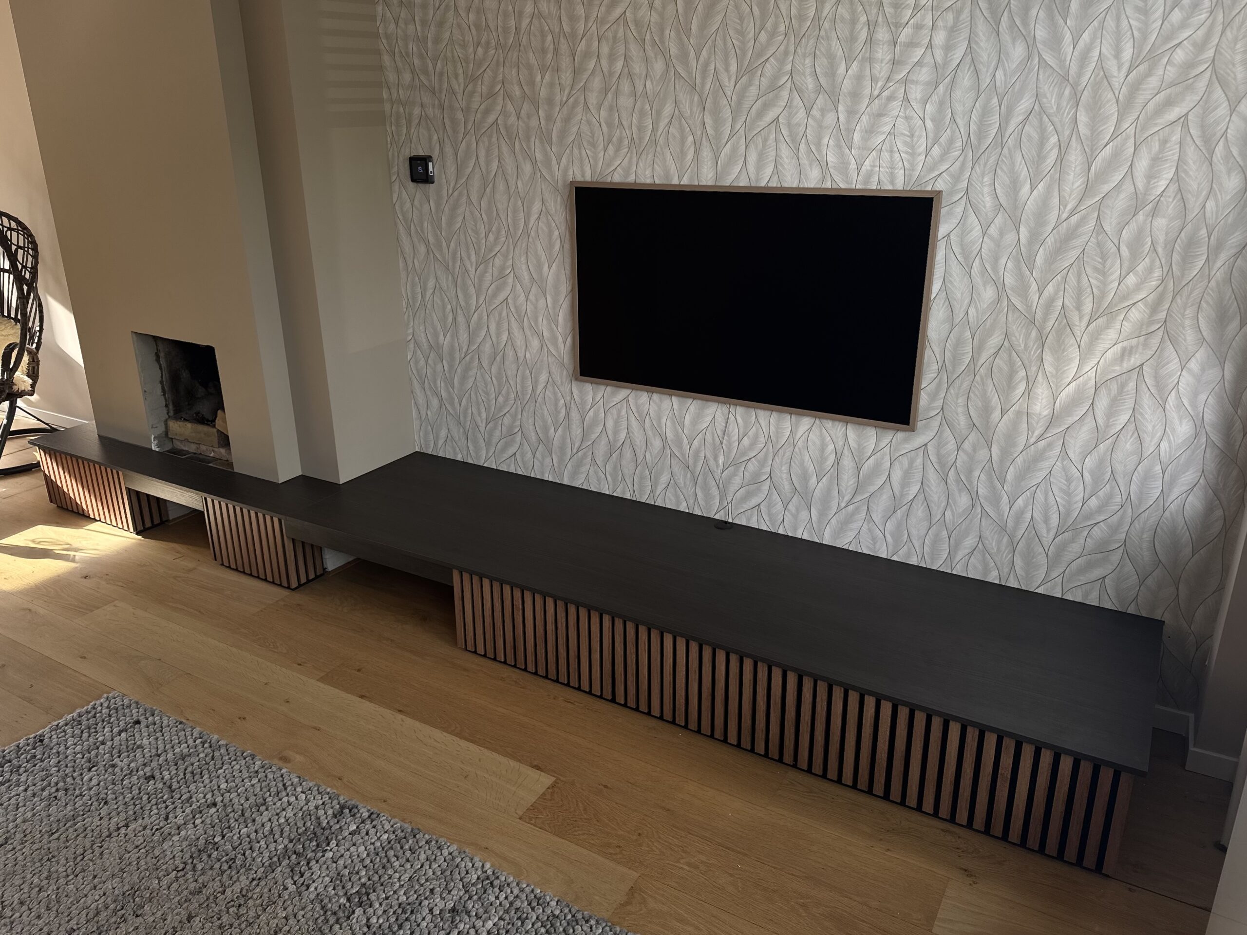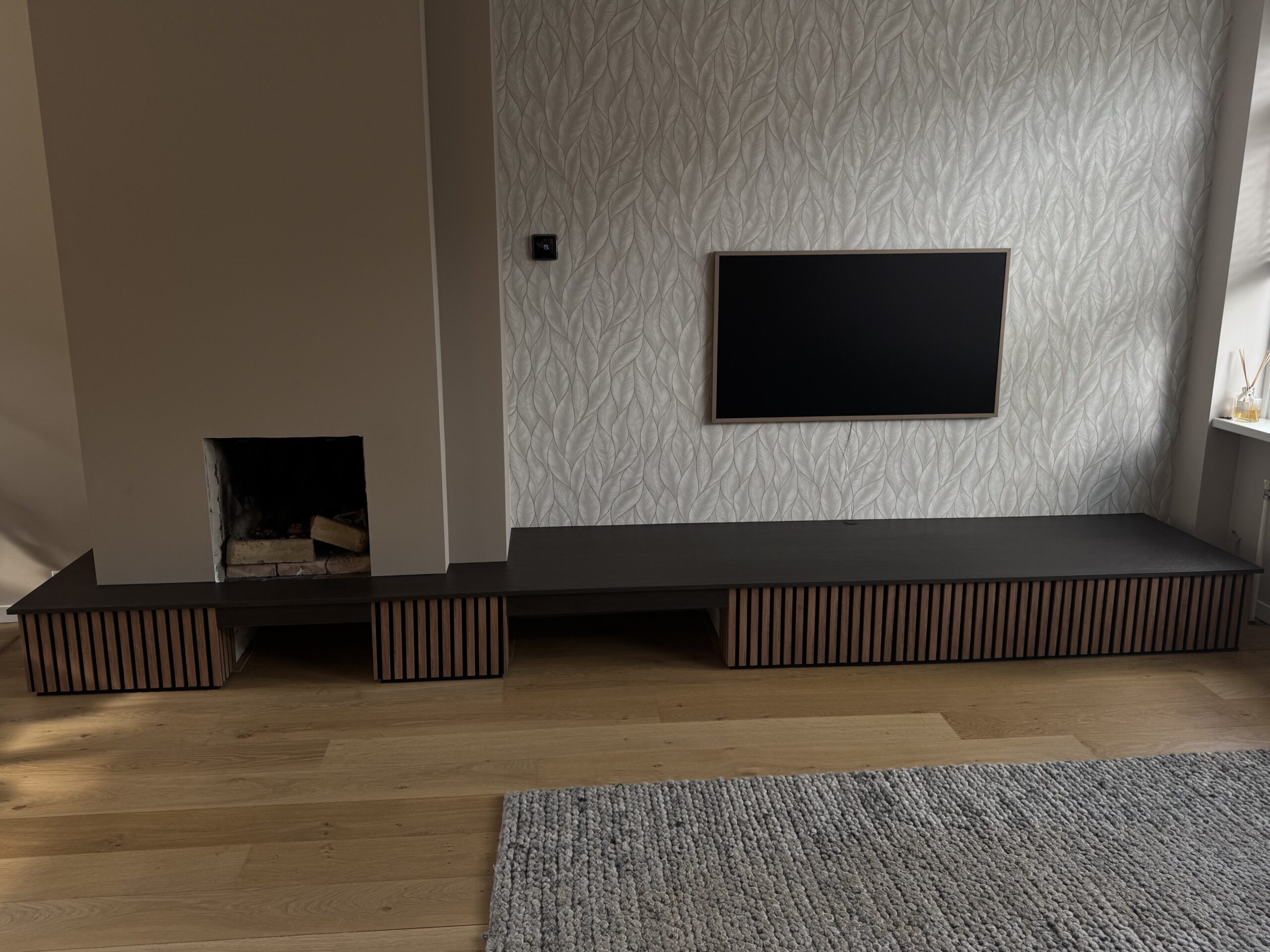 Het lage dressoir onder de tv zorgt voor een strakke, moderne uitstraling en vormt een mooi geheel met het meubel en de rest van het interieur. Het materiaal dat is gebruikt is van Decolegno, bekend om zijn hoogwaardige en stijlvolle afwerking. De plaat heeft een diepe, donkere houtkleur met een subtiele nerfstructuur, waardoor het geheel zowel luxe als tijdloos oogt. Door het minimalistische ontwerp en de strakke lijnen ontstaat er rust en balans in de ruimte. Het meubel sluit mooi aan op de rest van het interieur en geeft het geheel een afwerking die het compleet maakt, zonder dat het te druk wordt.