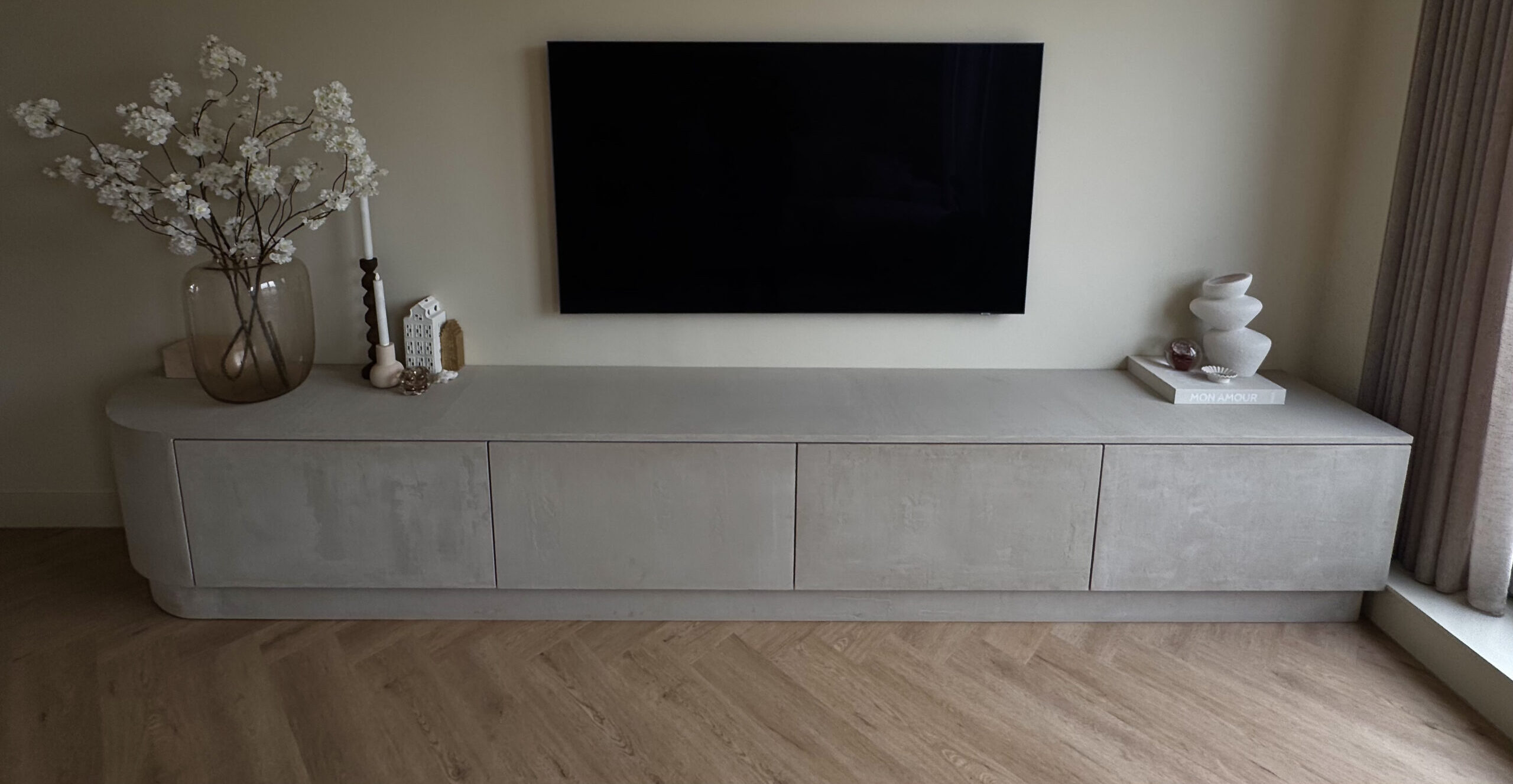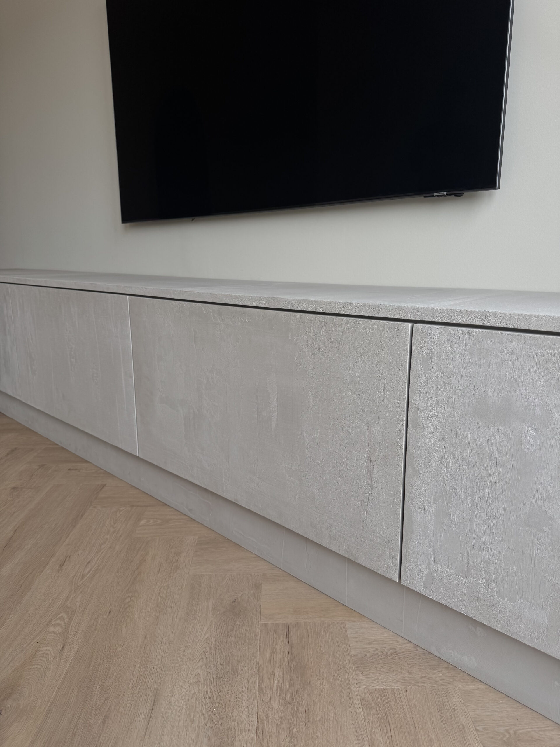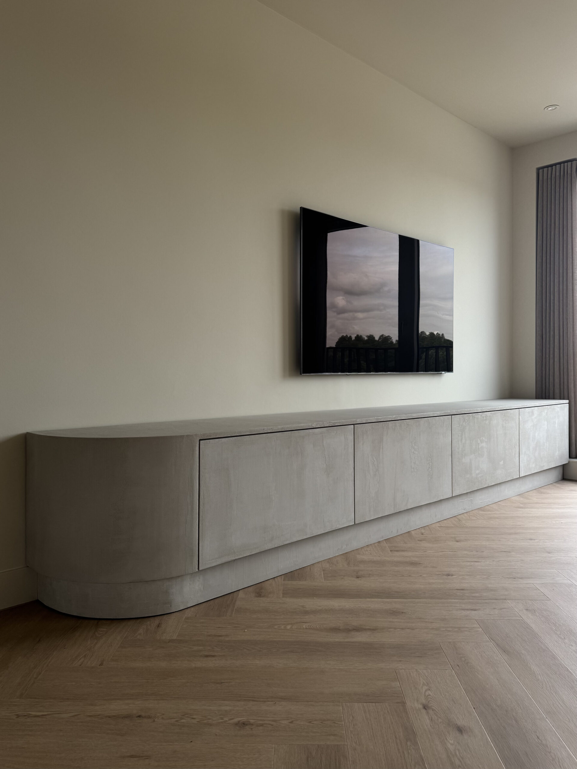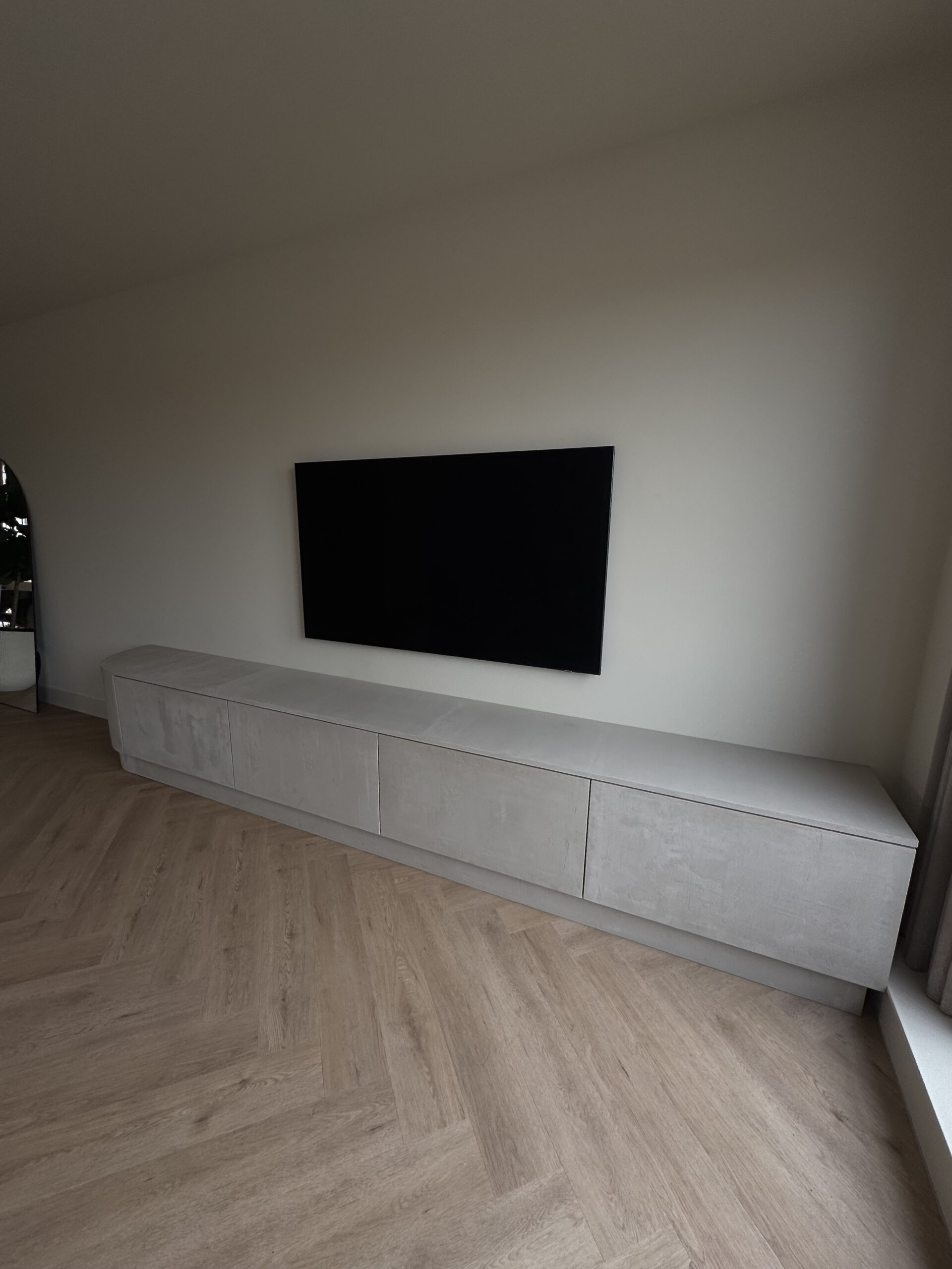 Dit moderne, op maat gemaakte tv-meubel, van maar liefst 4 meter lang is afgewerkt met betonciré. Dit zorgt voor een stoere industriële uitstraling. De afgeronde zijkant voegt een verfijnd detail toe en maakt het ontwerp elegant. Bent u benieuwd naar meer details? Neem dan contact op!